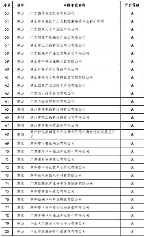 為貫徹落實《廣東省科學技術廳 廣東省財政廳關于科技企業孵化器、眾創空間后補助試行辦法(修訂)》(粵科規范字〔2018〕1號)文件,省科技廳組織專家對自愿參加2018年度科技企業孵化器、眾創空間運營評價的單位進行評價。通過形式審查、定量指標初審、專家評審等程序,確定評為優秀(A級)的孵化器89家,評為良好(B級)的孵化器53家,評為合格(C級)的孵化器69家;評為優秀(A級)的眾創空間80家,評為良好(B級)的眾創空間92家,評為合格(C級)的眾創空間48家。