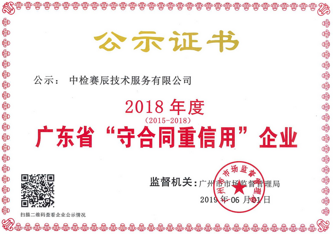 日前,廣東省市場監(jiān)督管理局正式公示了2018年度“廣東省守合同重信用企業(yè)”名單,中檢賽辰技術(shù)服務(wù)有限公司憑借良好的信譽(yù)與契約精神順利通過評(píng)審,已連續(xù)四年(2015-2018)獲得此項(xiàng)殊榮,同時(shí)彰顯了中檢賽辰企業(yè)的信用體系建設(shè)及維護(hù)合同信用等方面得到工商和市場監(jiān)管部門的高度認(rèn)可。