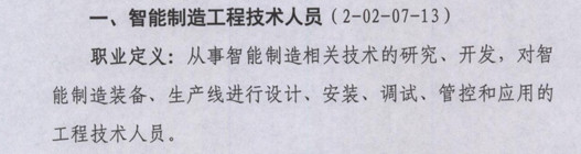 像《通告》里的智能制造工程技術人員,職業定義為:從事智能制造相關技術的研究、開發、對智能制造裝備、生產線進行設計、安裝、調試、管控和應用的工程技術人員。