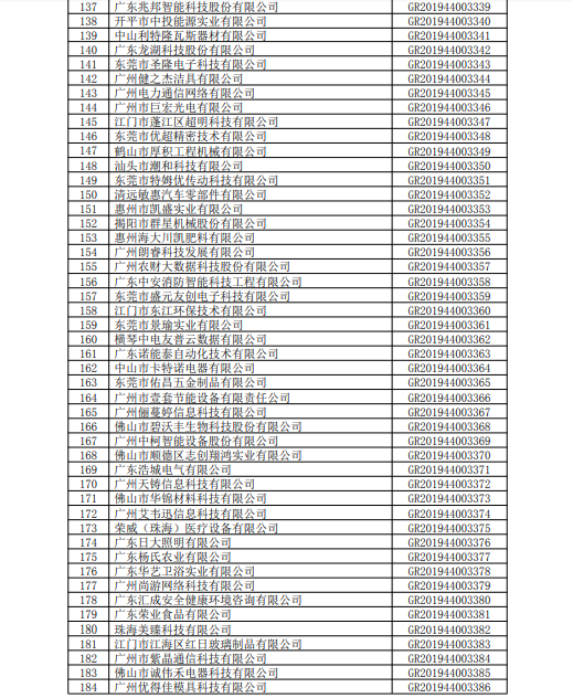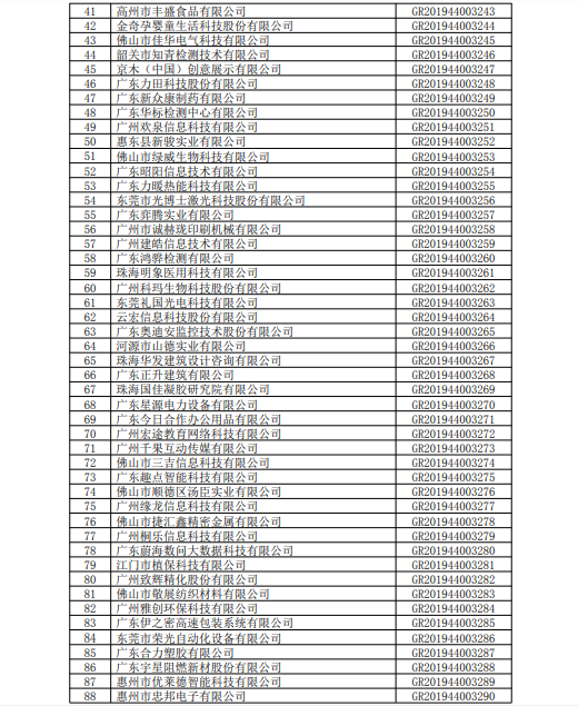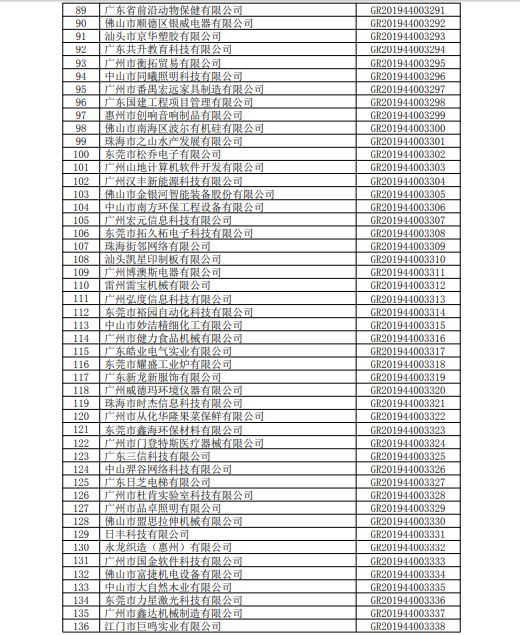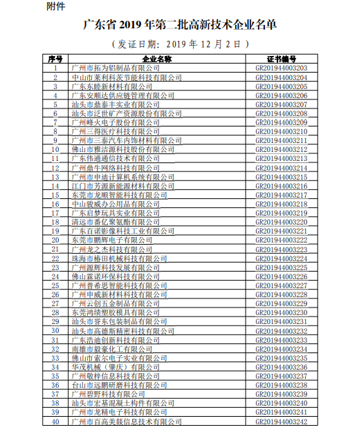 你們上報的《關(guān)于廣東省2019年高新技術(shù)企業(yè)認(rèn)定備案的函》(粵科函高字〔2019〕1730號)收悉。現(xiàn)將公示無異議的廣州市拓為鋁制品有限公司等4090家企業(yè)予以高新技術(shù)企業(yè)備案。請你們按照《廣東省2019年第二批高新技術(shù)企業(yè)名單》(詳見附件)中的企業(yè)名稱、高新技術(shù)企業(yè)證書編號和發(fā)證日期打印并頒發(fā)“高新技術(shù)企業(yè)證書”。