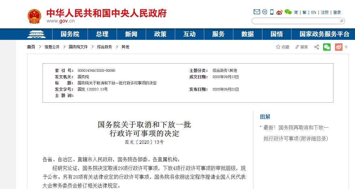 經(jīng)研究論證,國務(wù)院決定取消29項(xiàng)行政許可事項(xiàng),下放4項(xiàng)行政許可事項(xiàng)的審批層級,現(xiàn)予公布。另有20項(xiàng)有關(guān)法律設(shè)定的行政許可事項(xiàng),國務(wù)院將依照法定程序提請全國人民代表大會常務(wù)委員會修訂相關(guān)法律規(guī)定。